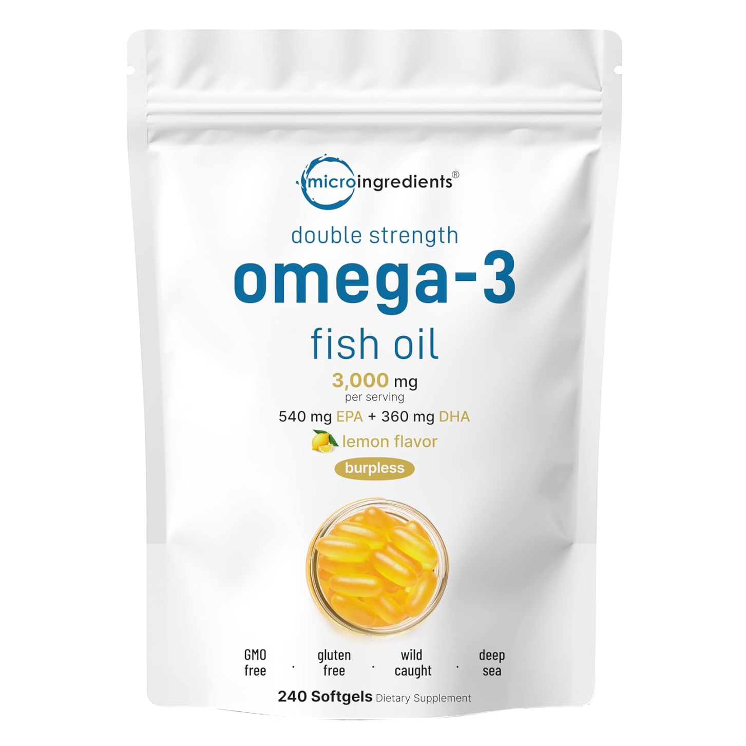 Micro Ingredients Omega-3 Fish Oil Burpless Lemon Flavor 240 Softgels